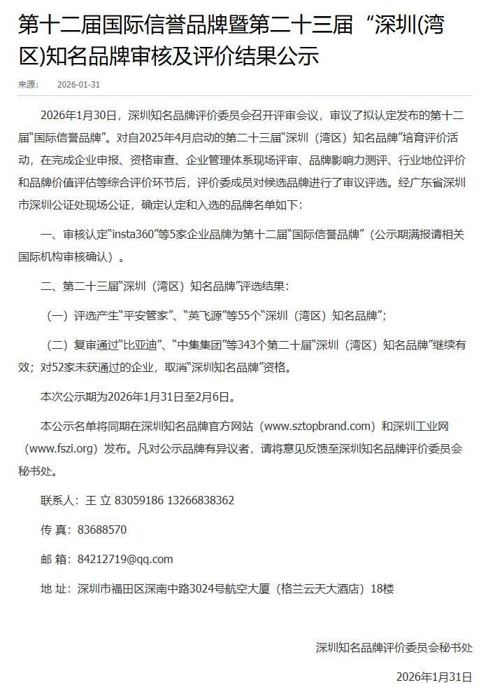 第十二届国际信誉品牌暨第二十三届“深圳(湾区)知名品牌审核及评价结果公示