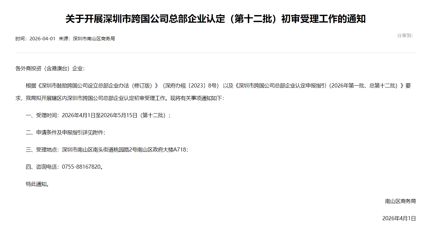 一、受理时间(第十二批) 2026年4月1日 – 2026年5月15日期间各区外资主管部门及前海管理局开展初审受理。二、申报对象与条件1. 适用对象申报认定的跨...