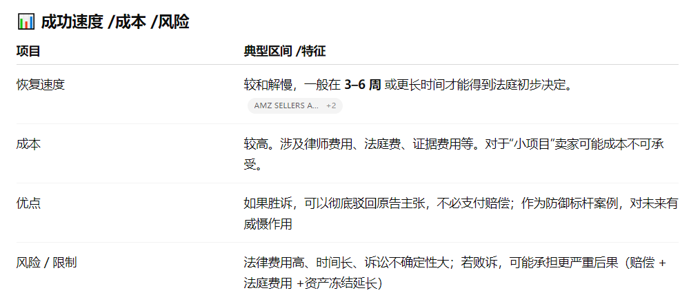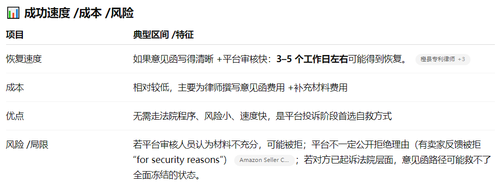 一、TRO vs 投诉 vs 平台申诉 核心判断点: 1.如果你收到了法院层面的通知 / TRO 命令 / 资金被冻结,那就已进入司法层面,应优先考虑法律动议 / 和解路径。 2.如果还只是被平台投诉 / listing 被下架(但尚未涉及法院),那“不侵权意见函”路径可能是最快的自救方式。 二、路径一:和解 / 达成协议 1.适用场景 对方已经提起诉讼或已有法院 TRO 令,但你判断自己如果继续打可能成本太高。 你急需恢复销售 / 提取被冻结的资金 / 解禁 ASIN。 你愿意为“换时间”付出一定费用(赔偿 / 和解款)。 2.操作思路 ①确定对方身份与案件详情 ②评估侵权风险 /责任强弱 ③律师或代理发起和解谈判 ④签署和解协议 / 撤诉 / 递交法院文件 ⑤通知平台 /提交通知 ⑥款项 / 解冻 /恢复流程 平台(如 Amazon)在收到法院撤诉 / retraction /解冻指令后,一般会在数个工作日内释放资金或恢复 ASIN。 注意点 1.在谈判中,要尽可能保留“撤诉 + retraction”条款 —— 让对方在退款 /解冻后主动提交撤诉 / retraction。 2.和解协议里应约定对方不得再进行同一 ASIN /产品的投诉。 在提交给平台的 retraction /撤诉材料中,格式要符合法院 /平台要求,避免因为格式问题被驳回。 3.和解虽然快速,但在账面上看也可能被竞争对手认为“有错就赔”——要权衡公司长期形象。 三、路径二:法律动议 / 请法院解禁 当你认为原告起诉存在法律瑕疵或管辖权问题时,这条路径就是你的反击利器。它适用于已经进入法庭程序、资金被冻结 / TRO 已经下发的情况。 1.适用场景 收到法院的 TRO 或诉讼,以及法院管辖权 /合并不当 /起诉程序问题等可争议点。 你或你的律师认为原告起诉程序存在失误 /缺陷。 你有比较充足的证据 /抗辩理由,有能力承担一定的法律成本。 2.操作思路 1.请合适的美国律师(具备跨境 /电商 /知识产权经验)出面 2.准备动议文件 Motion to Dismiss / Motion to Strike / Motion to Dissolve TRO:根据案件特点提出驳回 / 解除申请 要求法院审查被投诉产品是否真的落入专利 /商标 /版权权利主张范围 如果是 TRO,还可以申请法院解除冻结 /放宽禁令 3.提交法庭 / 对方答辩 4.庭审 /法官裁定 5.法院判令生效后提交给平台 注意点 1.必须在法律规定的期限内提交动议,否则失去时效权利。 2.提交的动议材料要严格符合法院程序要求,结构清晰、论证充分。 3.在诉讼过程中要积极应对证据交换、对方反驳、庭审策略等。 4.如果案件规模不大的话,诉讼成本可能超过风险收益比。 四、路径三:不侵权意见函 / 申诉报告 这是平台层面的非诉讼自救路径,适用于尚未进入法院阶段,或你认为产品实际不构成侵权的情形。 1.适用场景 平台(如 Amazon)内部收到投诉,listing 被下架 / 被提交侵权警告,但尚未收到账面冻结、法庭文件等。 你有较强的理由 /证据表明产品 不落入被控权利的范围(例如专利权利要求对照、设计区别、使用许可、优先销售等)。 你有条件聘请具资质(USPTO 注册 /有电商经验)的律师撰写意见函。 2.操作思路 ①聘请合格律师撰写意见函 / 报告 ②意见函 / 报告应包含的核心内容 律师身份 /资质说明(如州律师、USPTO 注册号) 针对被诉权利主张(如专利中的每个权利要求条款)逐条对照分析,指出你的产品与其的区别或不落入该范围的理由 如果有无效 /公开文献 /先用 /公开销售等抗辩理由,也可附加说明 视觉对比图、结构图、说明书对比等清晰证明材料 ③通过平台的申诉 / 提交通道提交意见函 /补充报告 ④跟进 /电话 /沟通 ⑤若意见函被接受,平台恢复 listing /解除投诉 /ASIN 上线;若被拒绝,再考虑提交法庭文件或和解路径。 注意点 1.有卖家反映:即便递交了被律所出具的意见函,也可能被平台拒绝且不给具体拒绝原因(“for security reasons”)ral。因此,意见函必须尽量严谨、内容详实。 2.Amazon 提示:对于专利侵权,平台可能要求提供 “法院命令 / 报告 /撤诉 /反对理由” 等证据之一才能恢复 ASIN。 3.Amazon 有一个中立评估机制(Utility Patent Neutral Evaluation / APEX / Amazon 的中立评估程序),用于专利争议的中立处理。这个机制可以作为意见函之外的另一种选择(尤其在双方对抗强烈时)。 4.在意见函中,不建议夹杂太多“情绪化、商业公平”论断,而应聚焦“权利对比 / 法律分析 /证据支撑”那条主线。 五、三条路径对比与组合策略 组合策略建议: 1.优先尝试意见函 / 平台申诉:对于尚未进入法院的投诉案件,先以最快、成本最低的方式尝试恢复; 2.若投诉升级 /收到法院文件,应立即转为第二 / 第一路径(即法律动议或和解); 3.若意见函提交中被平台拒绝,不要拖延,应迅速由律师评估是否走动议或谈和解; 4.若案件金额或风险较高,在初期就可同时让律师准备动议草稿 /和解谈判备选方案,以加快切换效率。 遭遇侵权投诉,最重要的是 “快、准、稳”。 如果你正面临侵权投诉 / TRO 冻结 / listing 被下架,我可以帮你评估当前阶段最优路径、模拟应对结构框架。